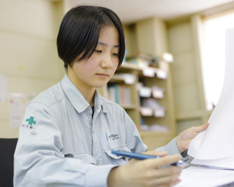 Itagaki has an environment in which it is easy to obtain qualifications, and there is also a system in place to properly evaluate these efforts. I also want to acquire a qualification for "ultrasonic testing" when I have more experience than I have now, and increase the range of my work. Quality control work is measured in millimeters and is often done silently by one person, so it is recommended for serious and patient people. It is a company where you can play an active role without discrimination between men and women, so please feel free to apply even if you are a woman.