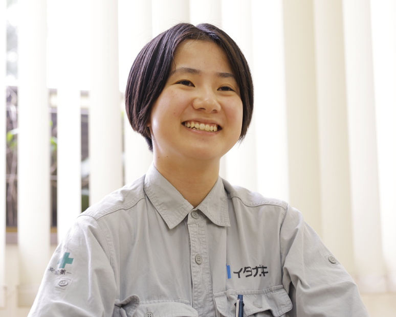 Joined Itagaki after graduating from technical high school. He is assigned to the Quality Control Section, where he measures the dimensions of the steel frames produced in the factory and checks and records the quality.